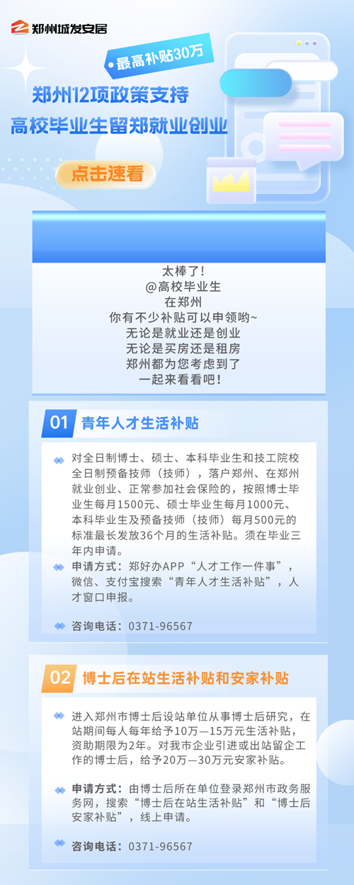近年來,鄭州市通過盤活存量房源用作人才公寓、發(fā)放購房租房補(bǔ)貼等形式,多渠道解決人才階段性居住需求。比如,鄭州市創(chuàng)新實施人才補(bǔ)貼,除了人才公寓以外,符合條件的博士、碩士、學(xué)士學(xué)位畢業(yè)生,5年內(nèi)分別可享每月3000元、1500元、1000元房租補(bǔ)助,購房給予10萬元到30萬元不等的一次性購房補(bǔ)貼。
