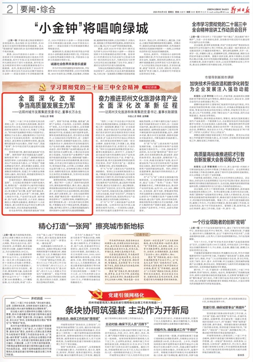 “黨的二十屆三中全會把深化國企改革納入進一步全面深化改革戰(zhàn)略、推進中國式現(xiàn)代化全局,為國有企業(yè)在新征程上改革轉(zhuǎn)型指明了前進方向,明確了工作重點。”鄭州城市發(fā)展集團有限公司黨委書記、董事長萬永生表示,城發(fā)集團將以習近平總書記關(guān)于全面深化改革的一系列新思想、新觀點、新論斷和全會精神為指導,通過戰(zhàn)略性重組和專業(yè)化整合,苦練“內(nèi)功”,筑強“筋骨”,爭當中國式現(xiàn)代化建設(shè)鄭州實踐的主力軍。