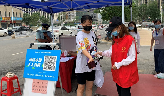 疫情防控刻不容緩。志愿者們首先仔細詢問了社區(qū)值守人員防疫工作流程及細節(jié),認真記錄社區(qū)防疫的步驟和相關要求。志愿者們配合社區(qū)工作人員提醒大家正確佩戴口罩,對進出社區(qū)人員進行健康掃碼和體溫測量,一個個忙碌的身影為社區(qū)抗疫一線筑牢“防護墻”。