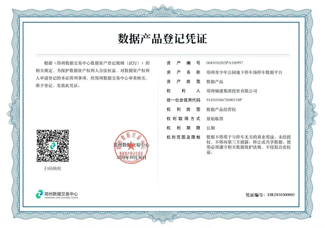 10月30日,城發(fā)集團(tuán)下屬子公司鄭州城建集團(tuán)投資有限公司(以下簡稱“城建集團(tuán)”)在鄭州數(shù)據(jù)交易中心成功完成了“鄭州青少年公園地下停車場停車數(shù)據(jù)平臺(tái)”數(shù)據(jù)產(chǎn)品的資產(chǎn)登記,喜獲數(shù)據(jù)產(chǎn)品登記憑證,成為鄭州市首家將停車數(shù)據(jù)資產(chǎn)入表的國有企業(yè)。
