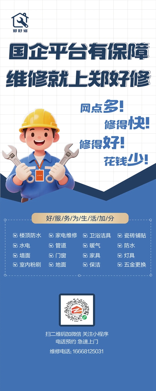 為切實(shí)解決群眾房屋維修難題,推動(dòng)鄭州市維修服務(wù)業(yè)邁向標(biāo)準(zhǔn)化、透明化、便捷化發(fā)展新征程,由鄭州城發(fā)集團(tuán)下屬子公司鄭州城發(fā)安居科技有限公司精心打造的“鄭好修”服務(wù)平臺(tái),正式上線運(yùn)營(yíng)。市民通過(guò)鄭州安居微信小程序、鄭州安居微信服務(wù)號(hào),即可輕松實(shí)現(xiàn)一鍵報(bào)修,享受優(yōu)質(zhì)高效的房屋維修服務(wù)。