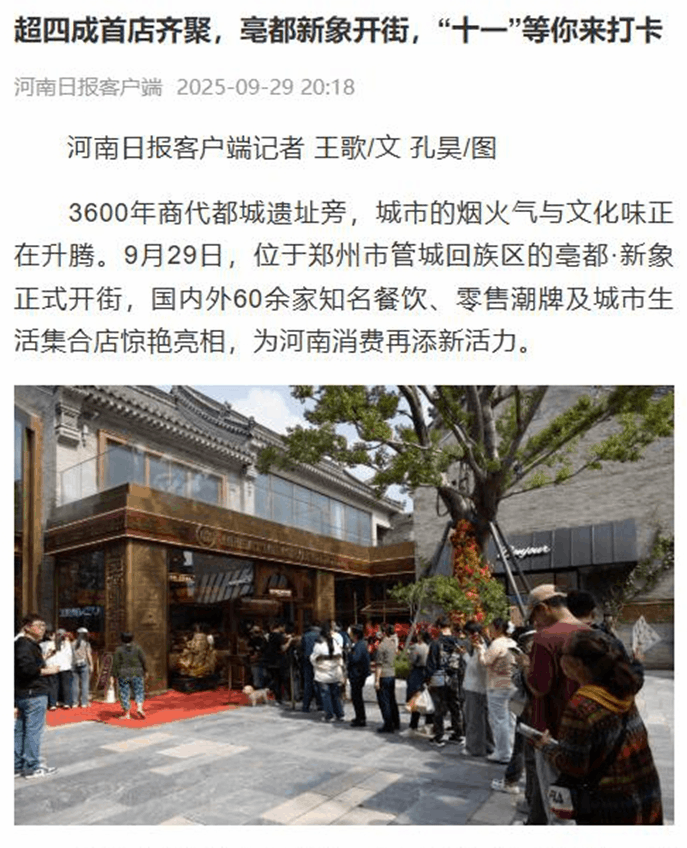 9月29日,備受矚目的城市更新標(biāo)桿項(xiàng)目——鄭州“亳都·新象”商業(yè)街區(qū)正式開(kāi)街迎客。憑借著獨(dú)特的文化魅力與商業(yè)風(fēng)格,開(kāi)街首日,街區(qū)人潮涌動(dòng),客流量突破10萬(wàn)人次,項(xiàng)目取得了1億+的線上累計(jì)曝光量。不僅銷售業(yè)績(jī)表現(xiàn)亮眼,取得了轟動(dòng)性的開(kāi)門紅,也收到了業(yè)界專家發(fā)來(lái)的賀詞和眾多媒體的報(bào)道。